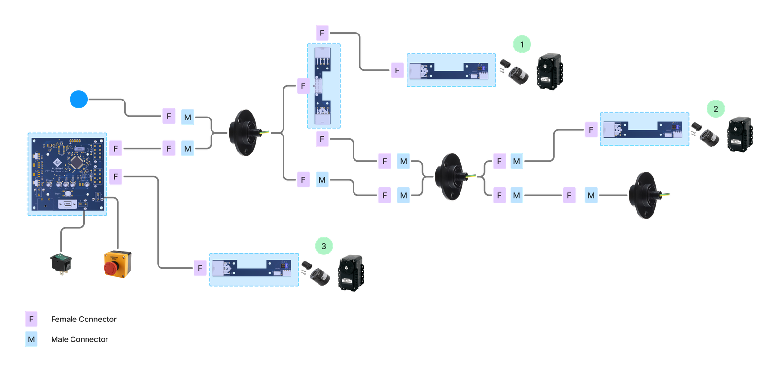 - When powering on the FFT Gyro System and connecting it to the PC, if there is a communication issue with one or two sensors/encoders, the corresponding Operation LED will turn off to indicate which sensor or motor is experiencing the problem. For example, the following representation shows that Sensor/Motor 1 is having an issue, while Sensor/Motors 2 and 3 are functioning as expected. This type of problem may occur if the main board is unable to establish communication with a particular sensor or motor.