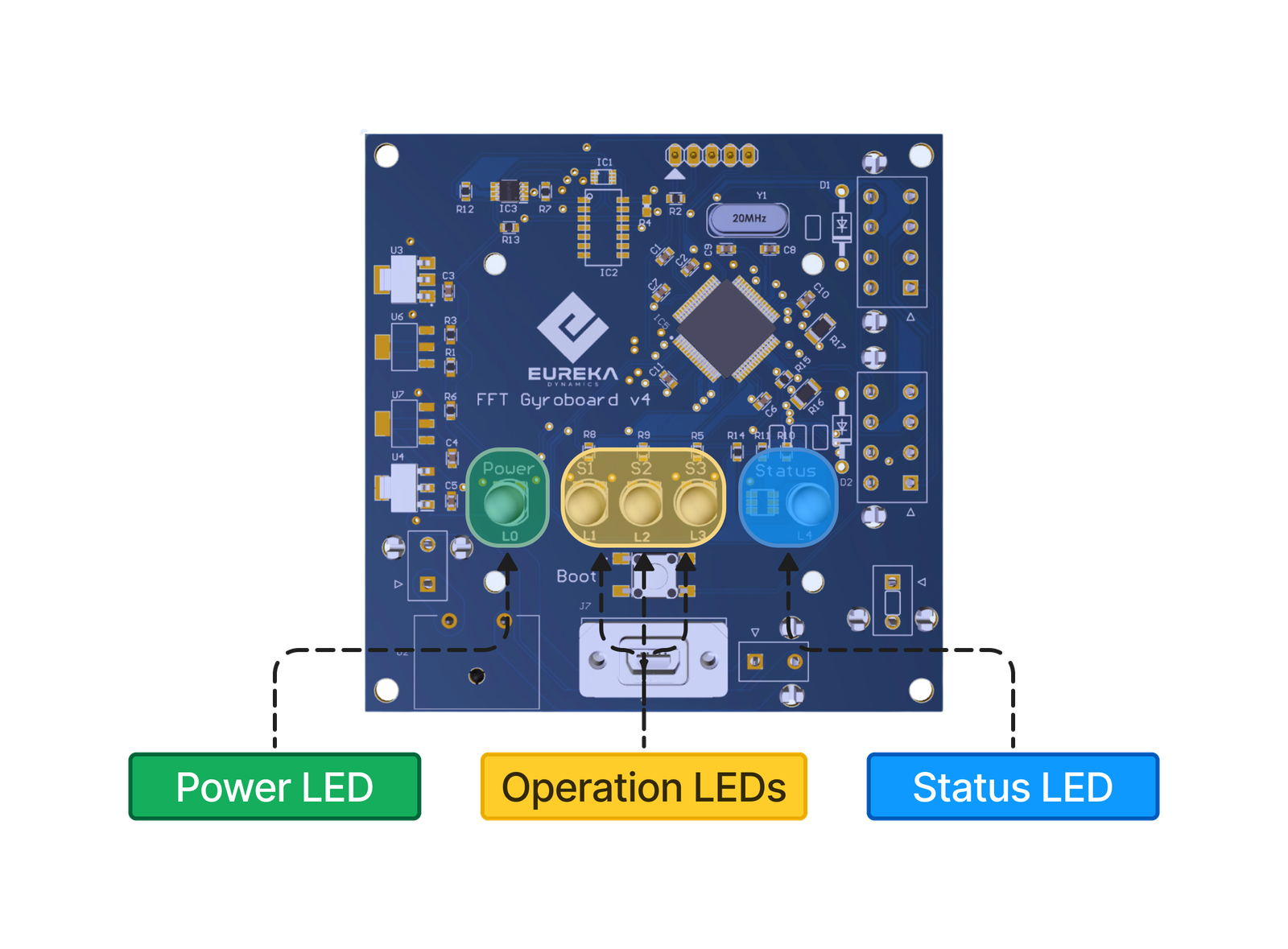 The FFT Gyro 4.0 system introduces a new feature that allows users to update the firmware of the main PCB. To enter this mode, known as Boot Mode, the user must press the button located inside the front panel of the structure for 3 seconds. Once activated, the Operation LEDs and the Status LED will blink in a 2-by-2 sequence, as shown in the following figure.