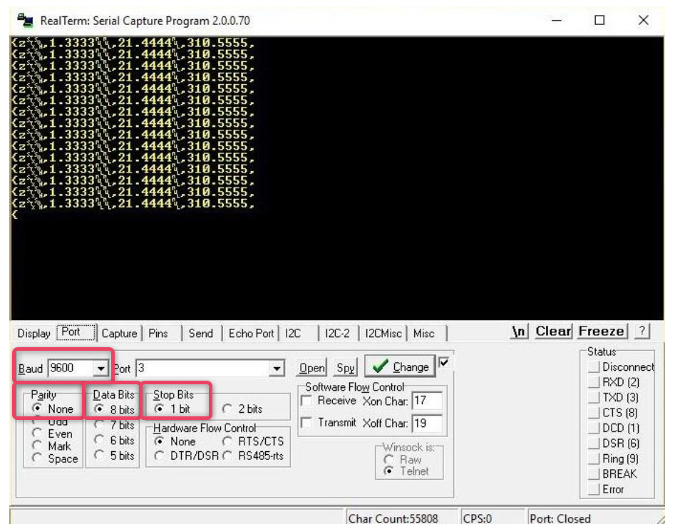 - The screen below shows RealTerm interface which is receiving data in the Encoder Mode.