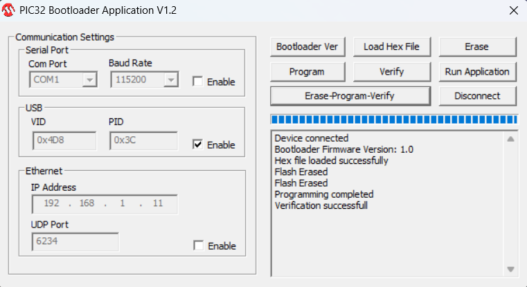 - Once the file was selected, now press the Erase-Program-Verify button, to upload the firmware. You should see a message in the little message box below, and if everything went well, the message should say something like the next image: