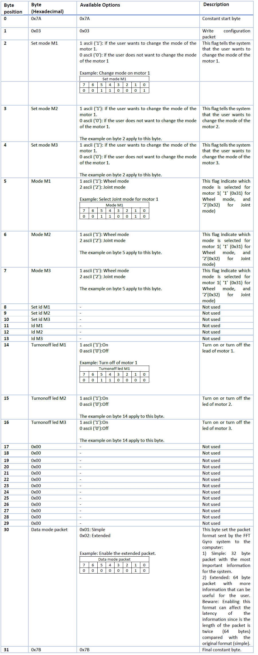 - The configuration packet is a 32 bytes packet that allows the user to set the configuration of the FFT Gyro motors and the motor's LEDs status.