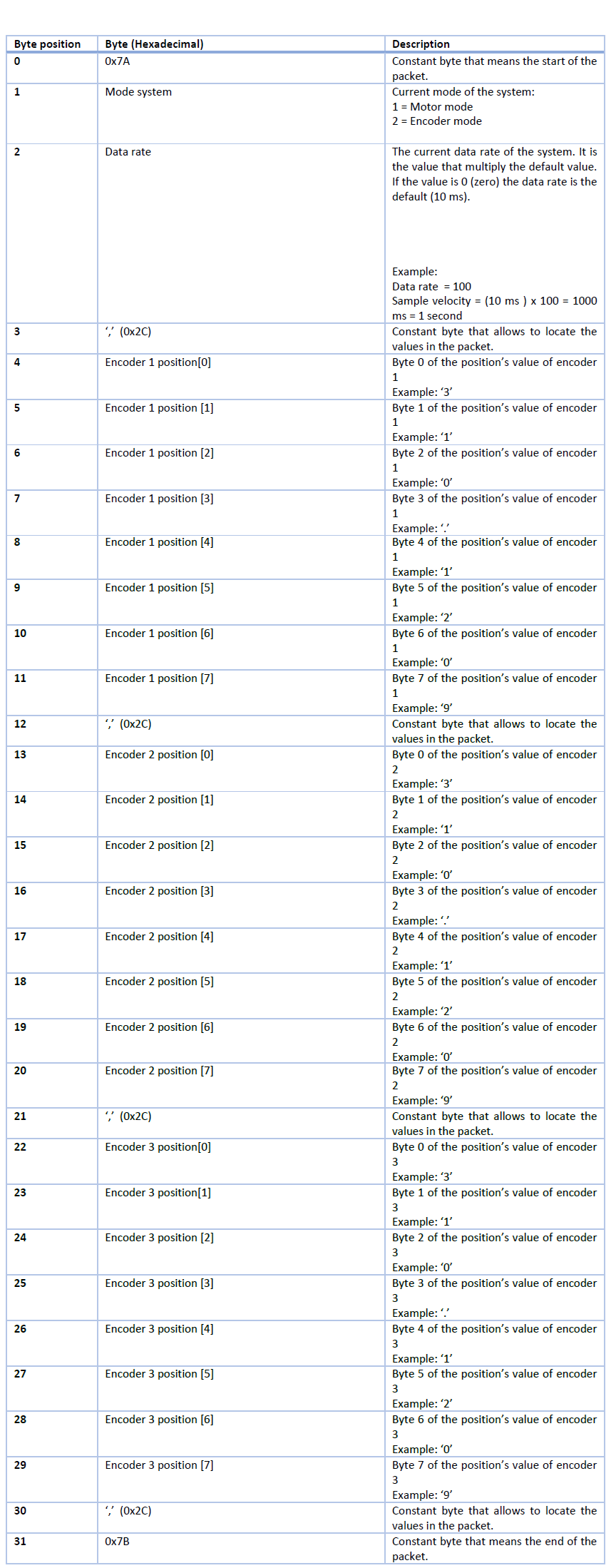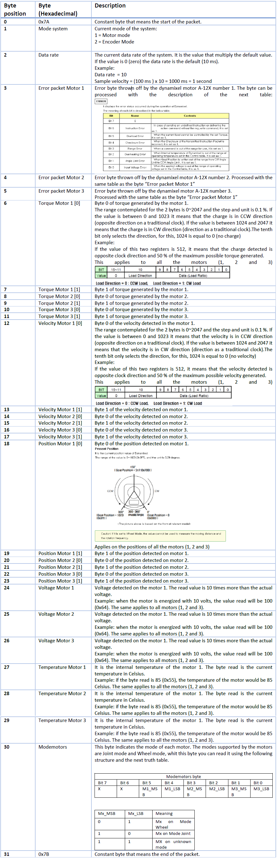 - In the Motors mode (as in the Encoders mode), a packet with 32 Bytes is used to read motor's position, motor's velocity, it's temperature, voltage and torque, each byte of the data packet is described below: