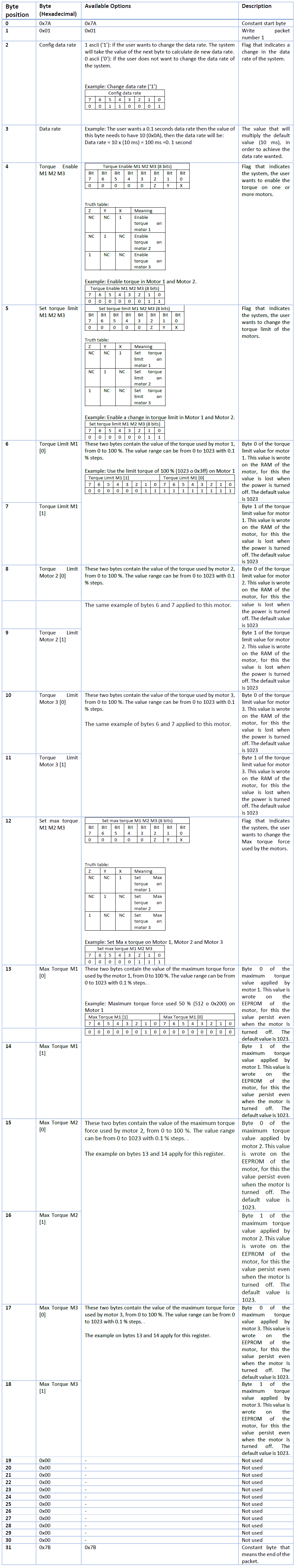 There are also write packets used to write and configurate some options from the motors. The majority of the optins of this packets only work when motors are mounted on the system.