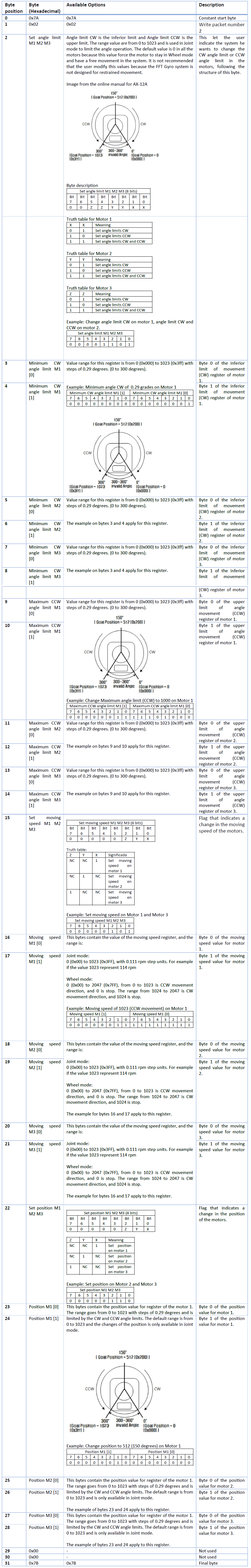 - Key attribute of the data packet include parameters related to the movement of the motors, as angle limit for the CW and CCW movement, goal position in Joint mode, velocity to reach the goal position, and velocity for free spin in Wheel mode